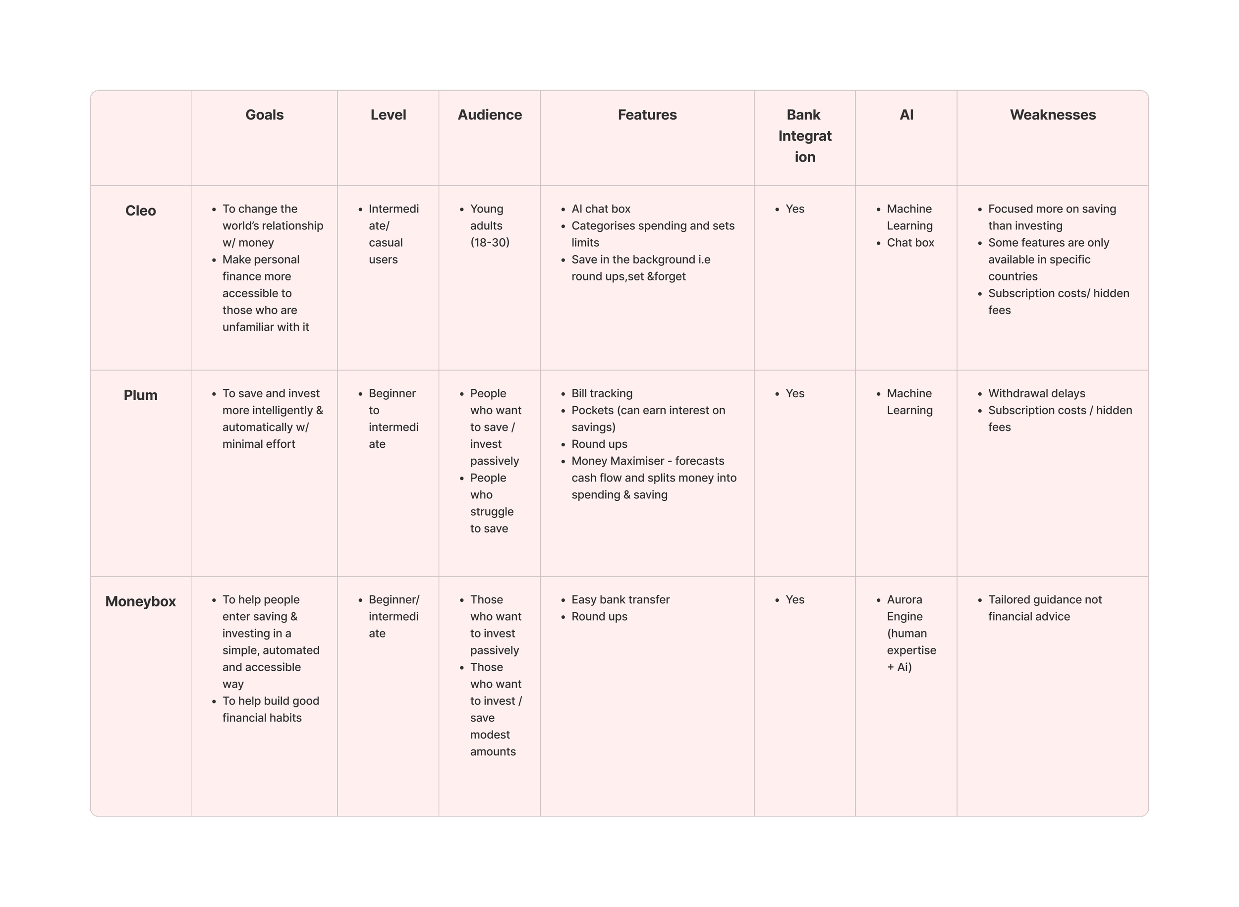 At the discovery stage, my focus was on building a clear understanding of the problem space before shaping any solutions. I started with desk research to explore the wider financial landscape, synthesising insights into a competitor analysis that highlighted patterns, gaps, and opportunities. This helped me understand where Clarity could meaningfully differentiate while staying grounded in real-world constraints.
