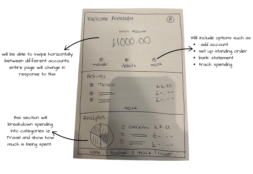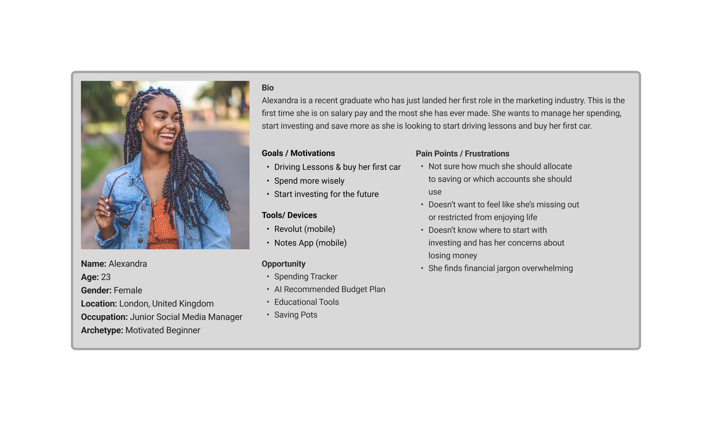 Once I had defined the users most common problems I then wanted to define the user. I did this by creating a persona and asked myself questions like: Who is most likely to struggle with budgeting? Where are they career wise? What responsibilities could they potentially have? From this I then created the persona below for Alexandra: