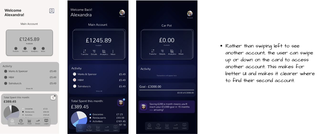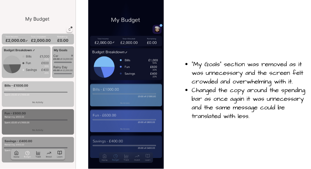 If I were to revisit this project, I would place greater emphasis on usability testing throughout the design process, particularly when validating interactions with the AI assistant. I would also introduce A/B testing to compare different budgeting interfaces and AI responses to determine which designs best encourage engagement and positive financial behaviors. I would also introduce measurable success criteria tied to business KPIs such as retention. These insights would allow for more informed iteration and a more effective final product.