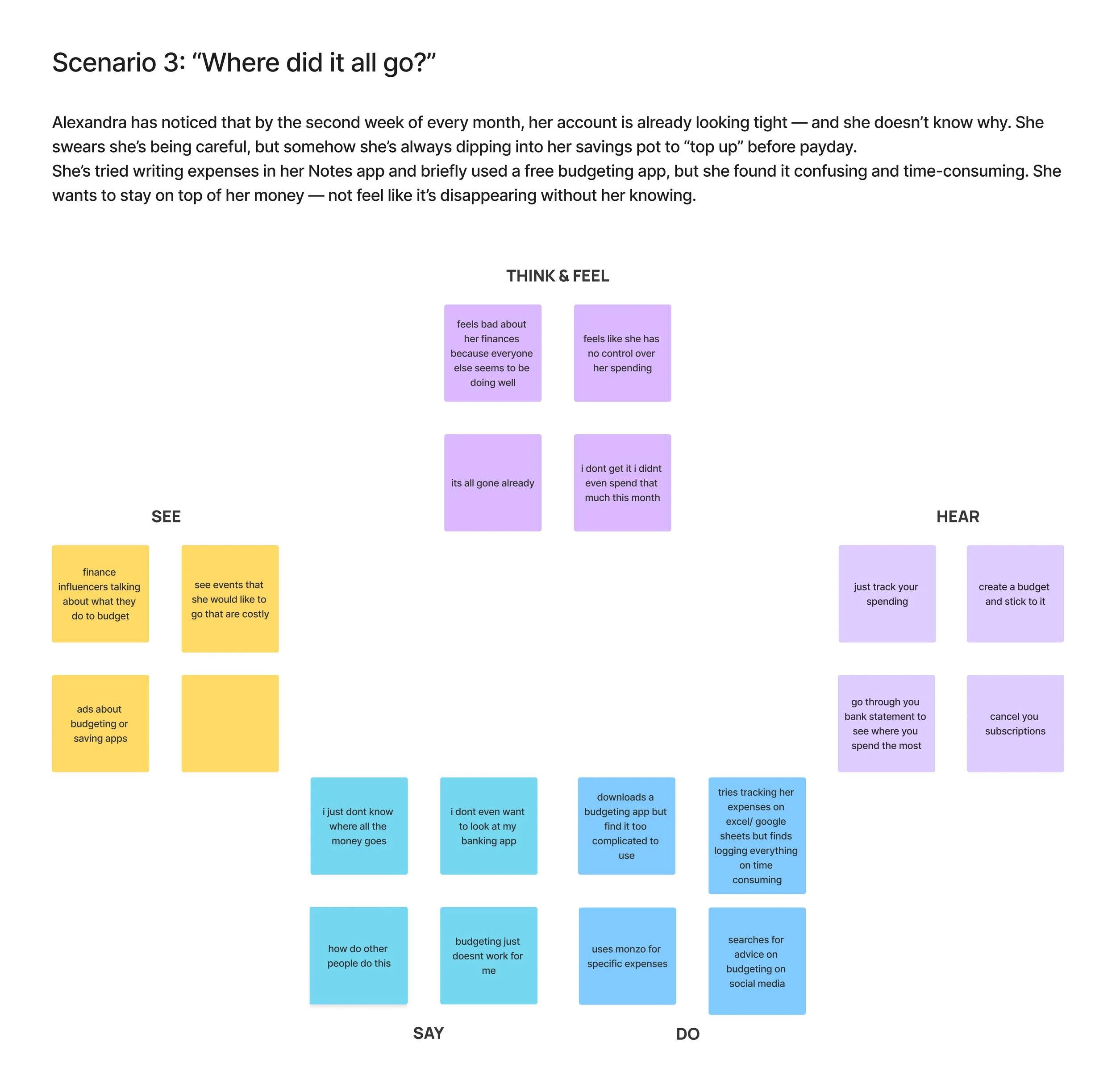 For the Empathy map I created 3 separate scenarios that Alexandra could potentially find herself in. Below is the 3rd one focused on budgeting: