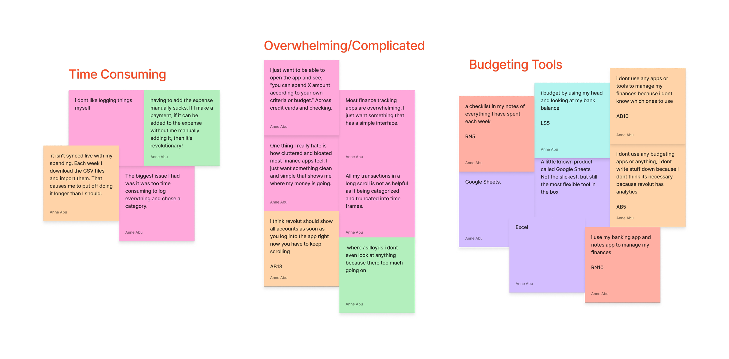 Time Consuming: Users found it to be too much effort to continuously log and have to update spreadsheets or trackers in order to stay on top of their spending. This puts them off having spreadsheets or budgets.