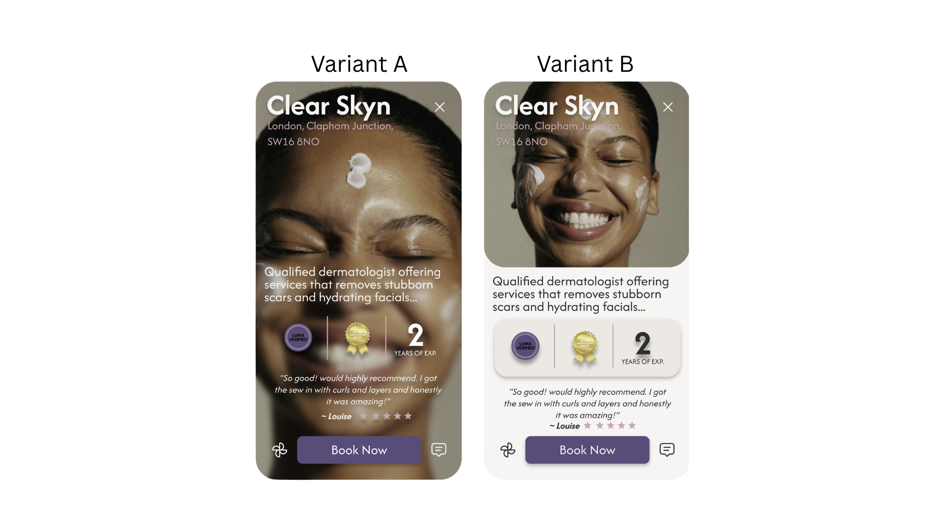 To determine which profile card layout better supports confident decision-making and encourages bookings, I conducted an A/B test comparing two interface variations. Both versions contained the same provider information—qualifications, reviews, experience, and booking CTA—but differed in visual hierarchy and information density.