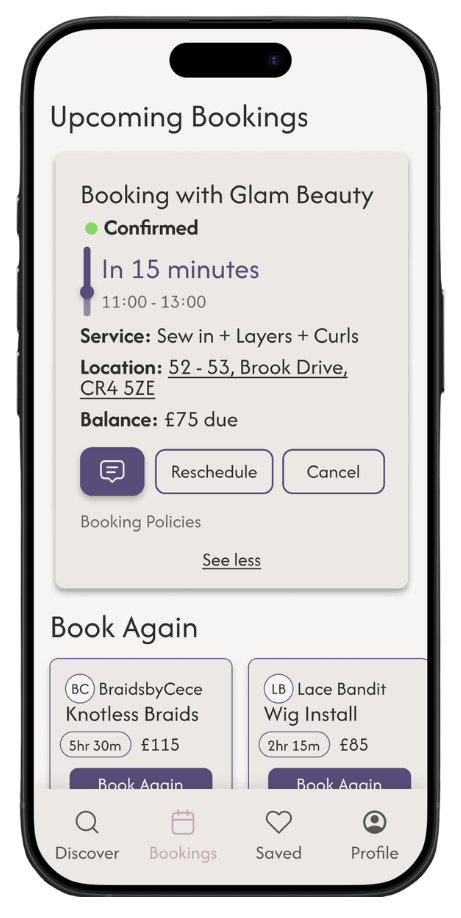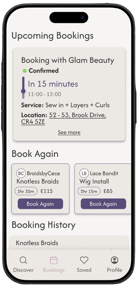 Users can check their booking status and any updates at any time within the “Bookings” section, while email and message notifications are sent upon confirmation to ensure users feel reassured and informed. Under “Upcoming Bookings” users are presented with a focused appointment view that surfaces the most relevant information at a glance, and then option to reveal extra details concerning appointment by clicking “see more” link. Live status updates, such as “30 minutes to your appointment,” alongside automatic reassurance email and message notifications will also be made available. This will help users feel informed and confident throughout the experience.