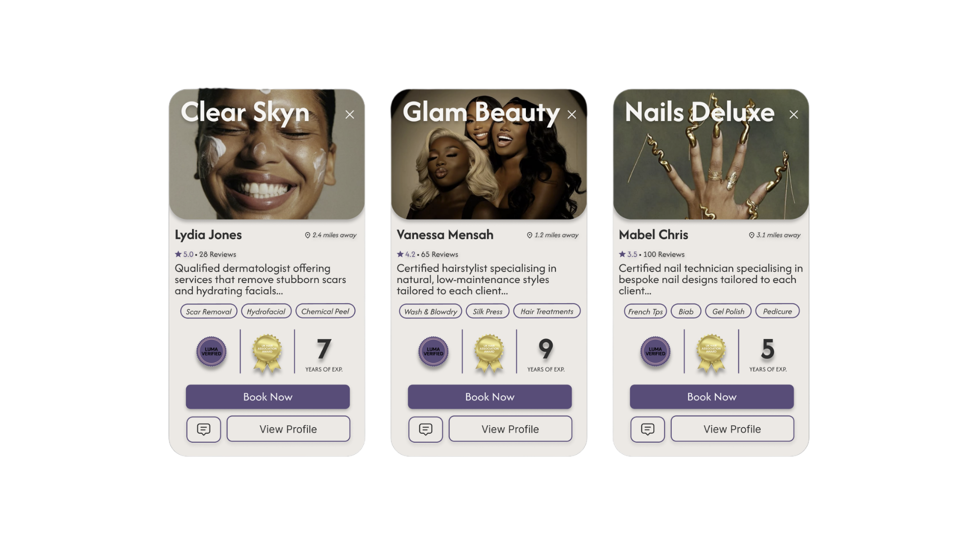 If brought to life, Luma could shift beauty service booking toward a confidence-led marketplace, where trust, professionalism, and reliability drive user decisions. By making provider qualifications, credibility, and appointment status more visible, the platform could reduce booking anxiety and enable more informed choices. Over time, this approach could help raise industry standards by rewarding professionals who prioritise transparency, skill, and consistent service quality.